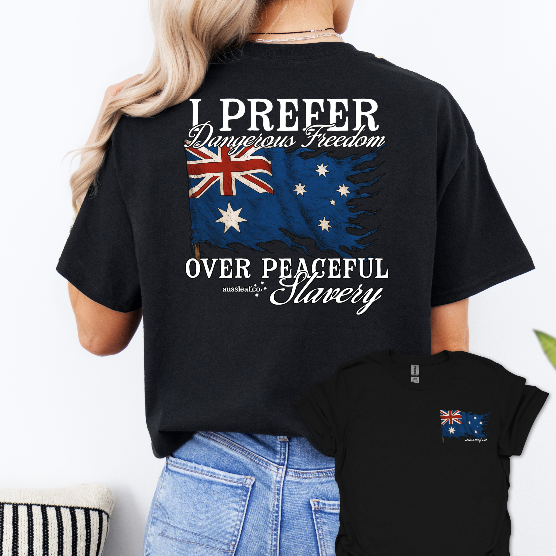 This Dangerous Freedom Over Peaceful Slavery shirt captures the heart of Australian independence and free speech. Featuring a distressed Australian flag waving proudly in the wind, it’s a bold statement for those who value liberty over compliance.