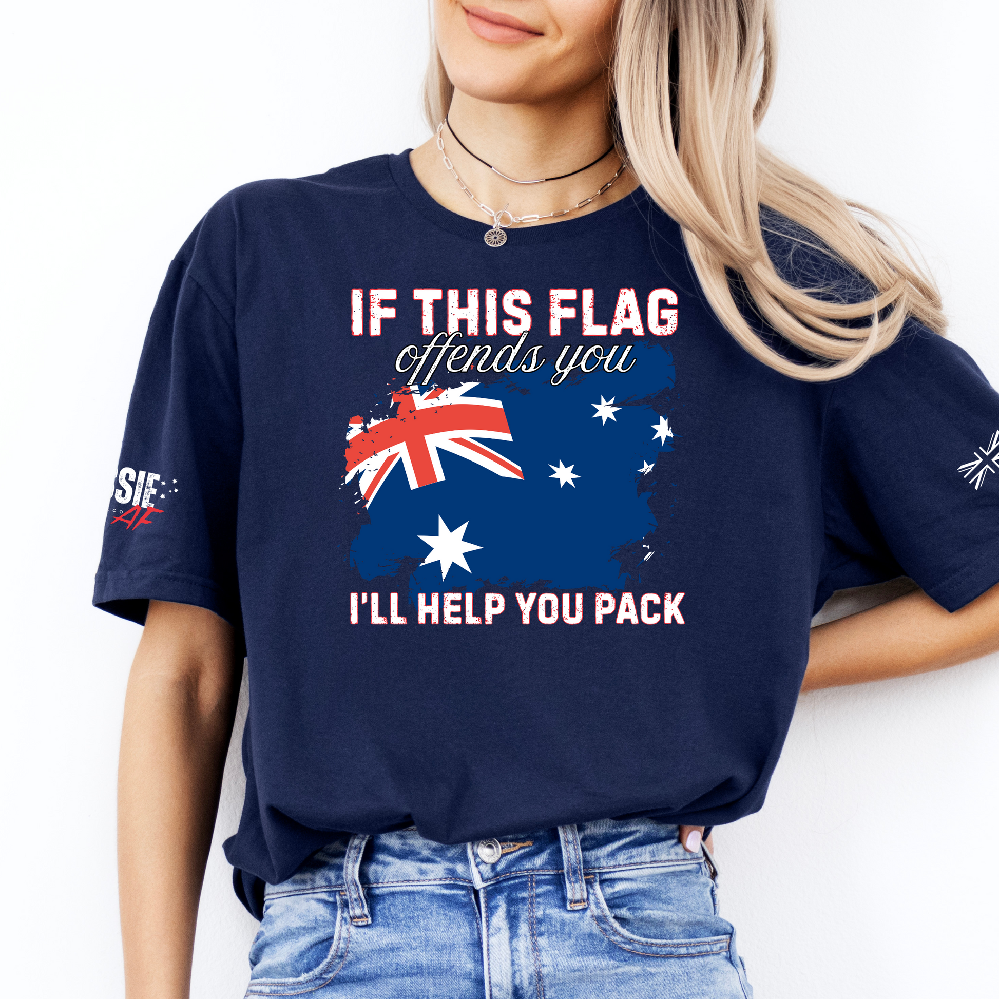 - Front chest print: “If This Flag Offends You, I’ll Help You Pack” with Australian flag