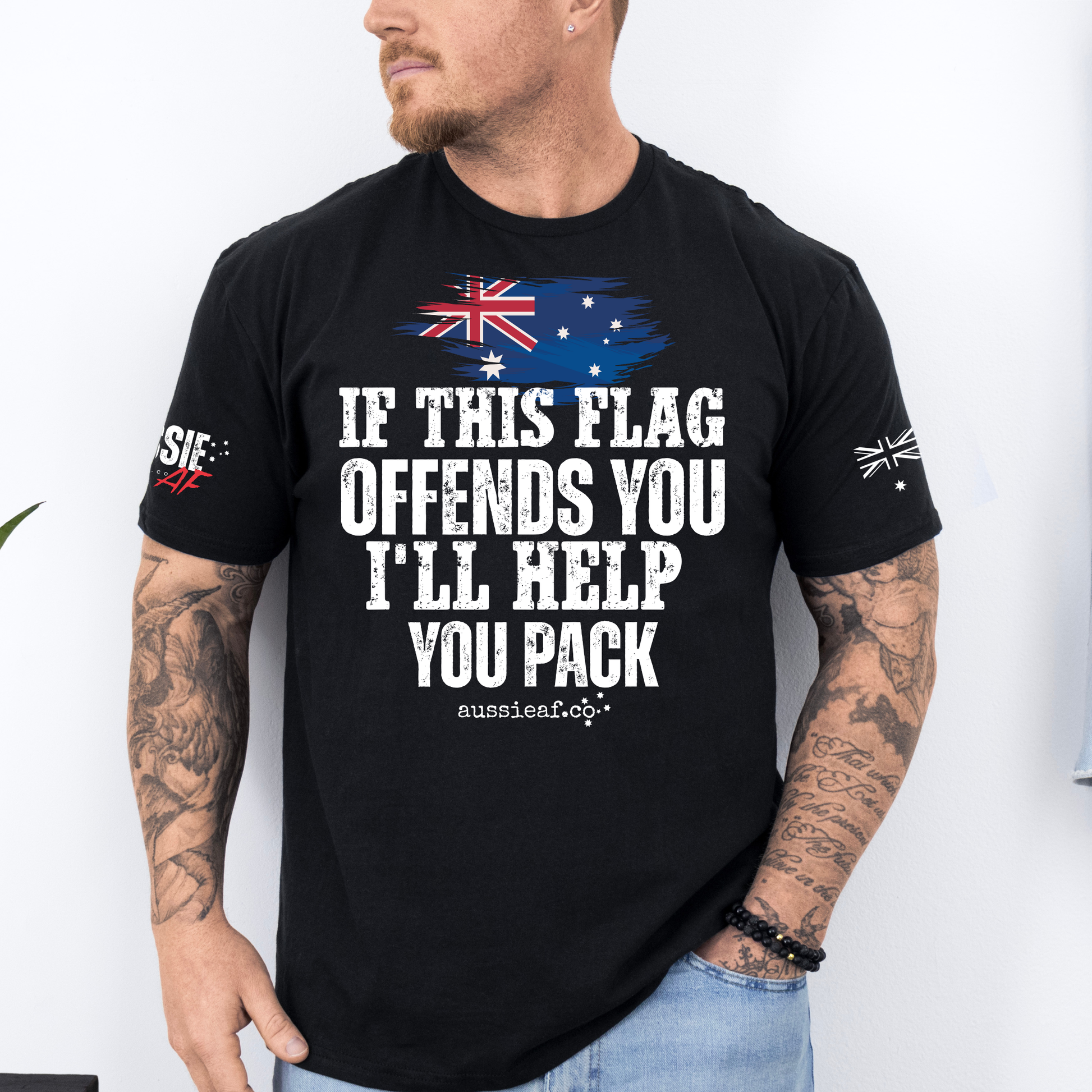 Stand proud and say what you mean with the “If This Flag Offends You, I’ll Help You Pack” t-shirt with sleeve printing.Designed and printed in Australia, this tee makes a statement that every true-blue Aussie can get behind. Whether you’re at a BBQ, the pub, or just out and about, it’s the perfect mix of comfort and conviction.