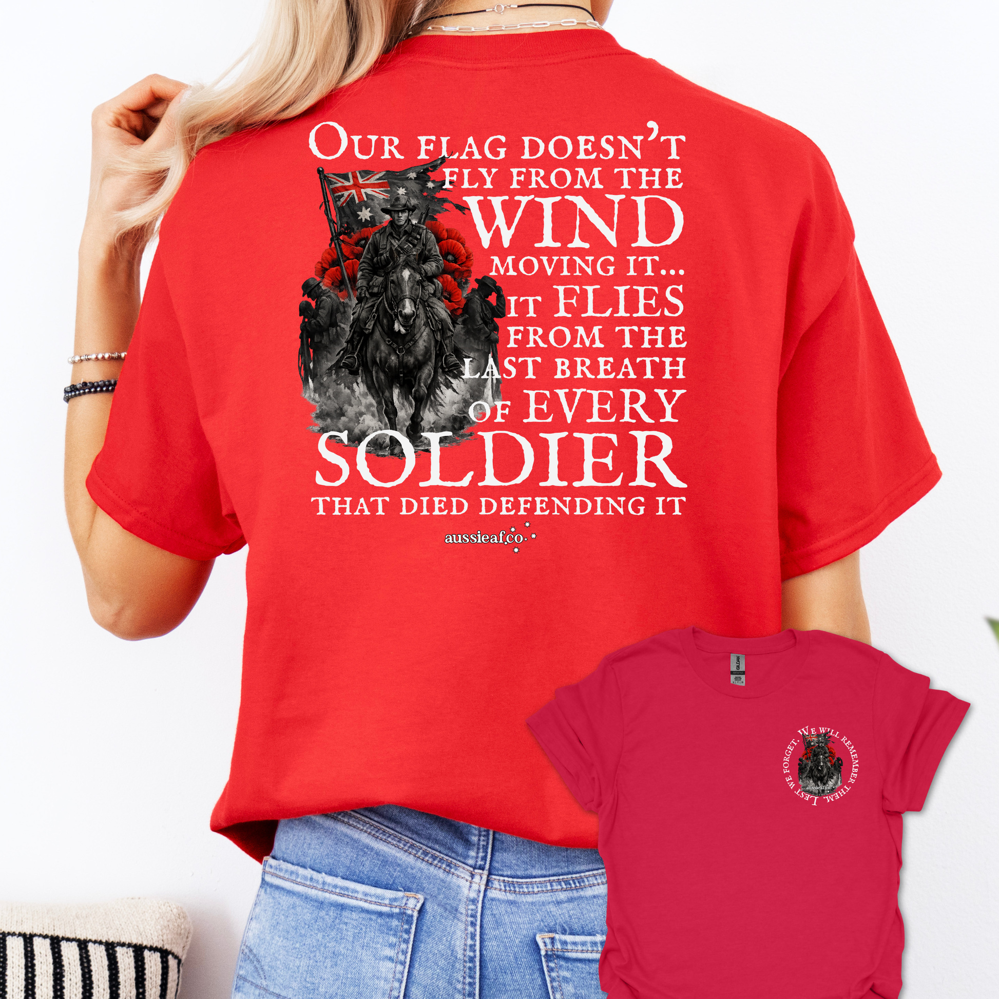 The tattered flag of Australia represents our country has been through yet still flies proudly above our nation. The shirt itself reads “Our Flag Doesn't Fly From the Wind Moving It, It Flies from the Last Breath of Every Soldier That Died Defending It.” this shirt stands as a symbol of courage, conviction, and remembrance.