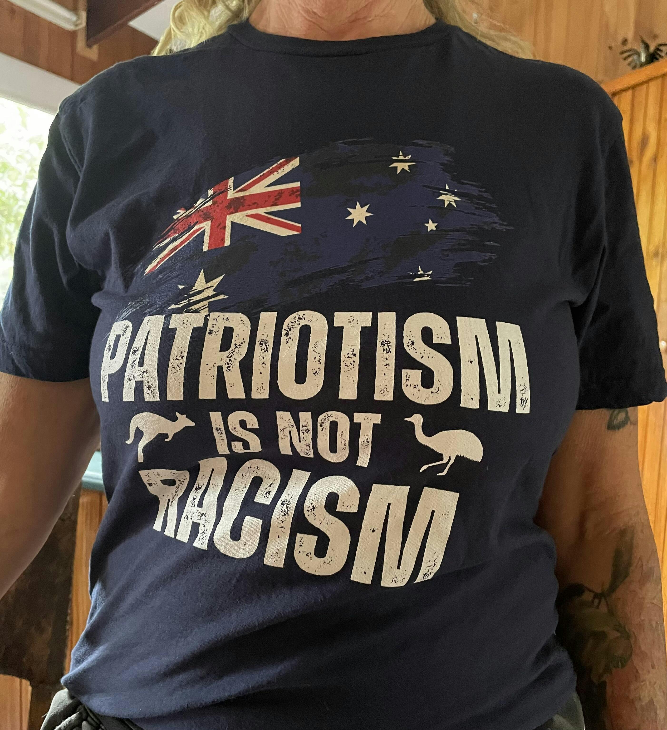 Front Print with Sleeve Printing: "Patriotism is not Racism" with the Australian flag design