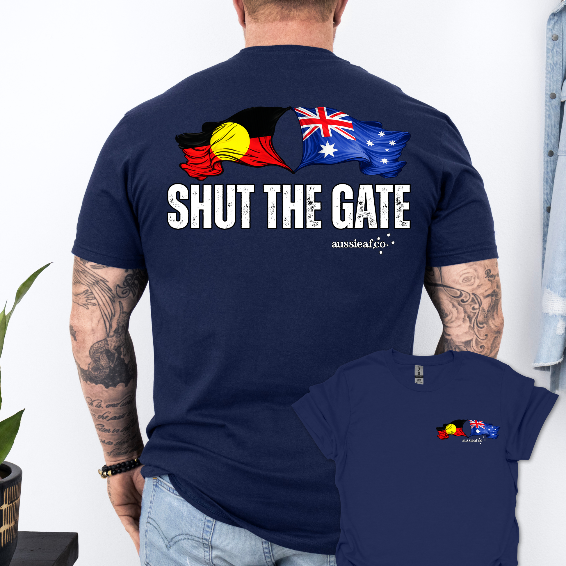Time to shut the gate and protect what we've built. Featuring the Aboriginal and Australian flags flying strong together, this "Shut The Gate" tee is a no-nonsense call to safeguard our shared heritage, borders, and way of life.