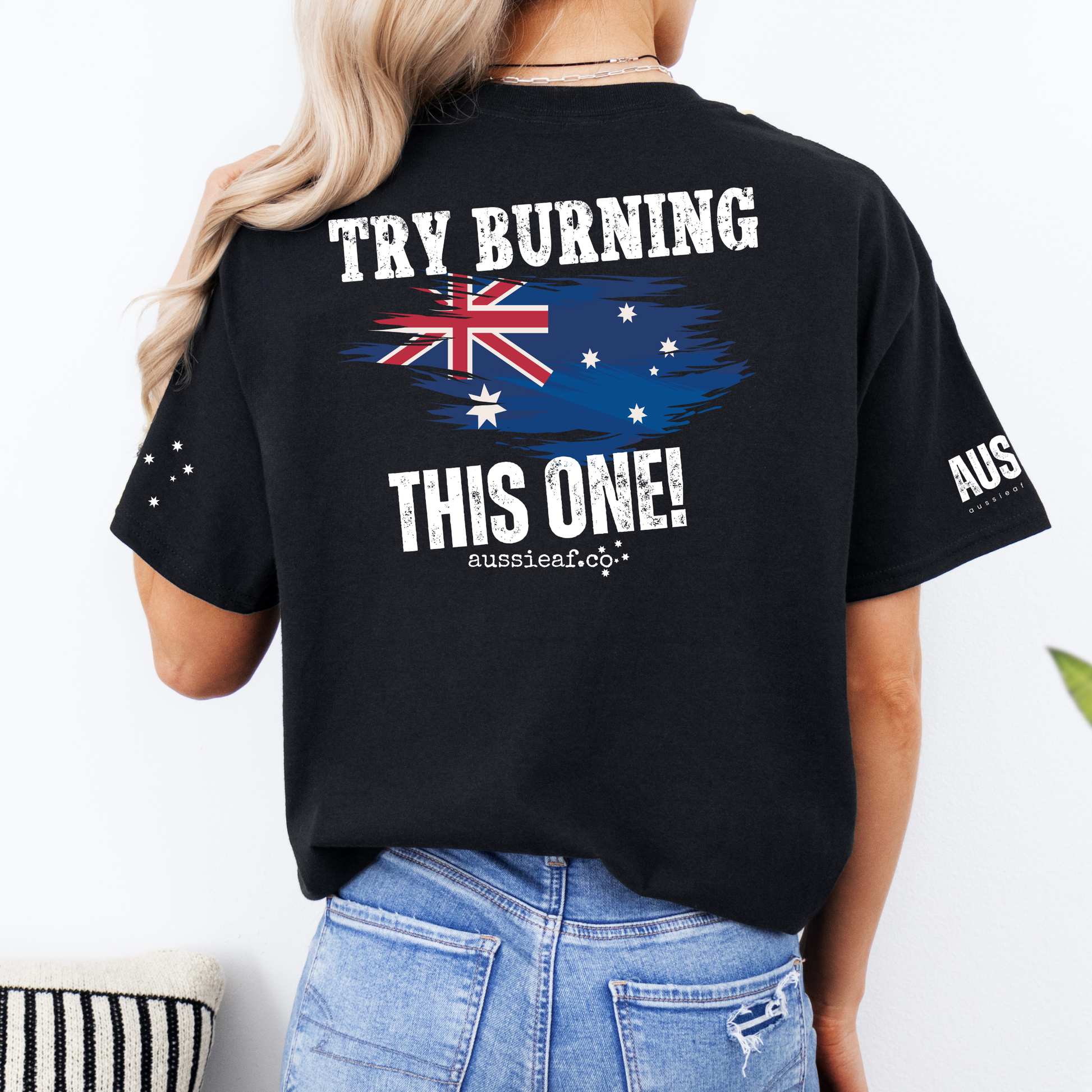 Stand proud and say what you mean with the “Try Burning This One” t-shirt.Designed and printed in Australia, this tee makes a statement that every true-blue Aussie can get behind. Whether you’re at a BBQ, the pub, or just out and about, it’s the perfect mix of comfort and conviction.
