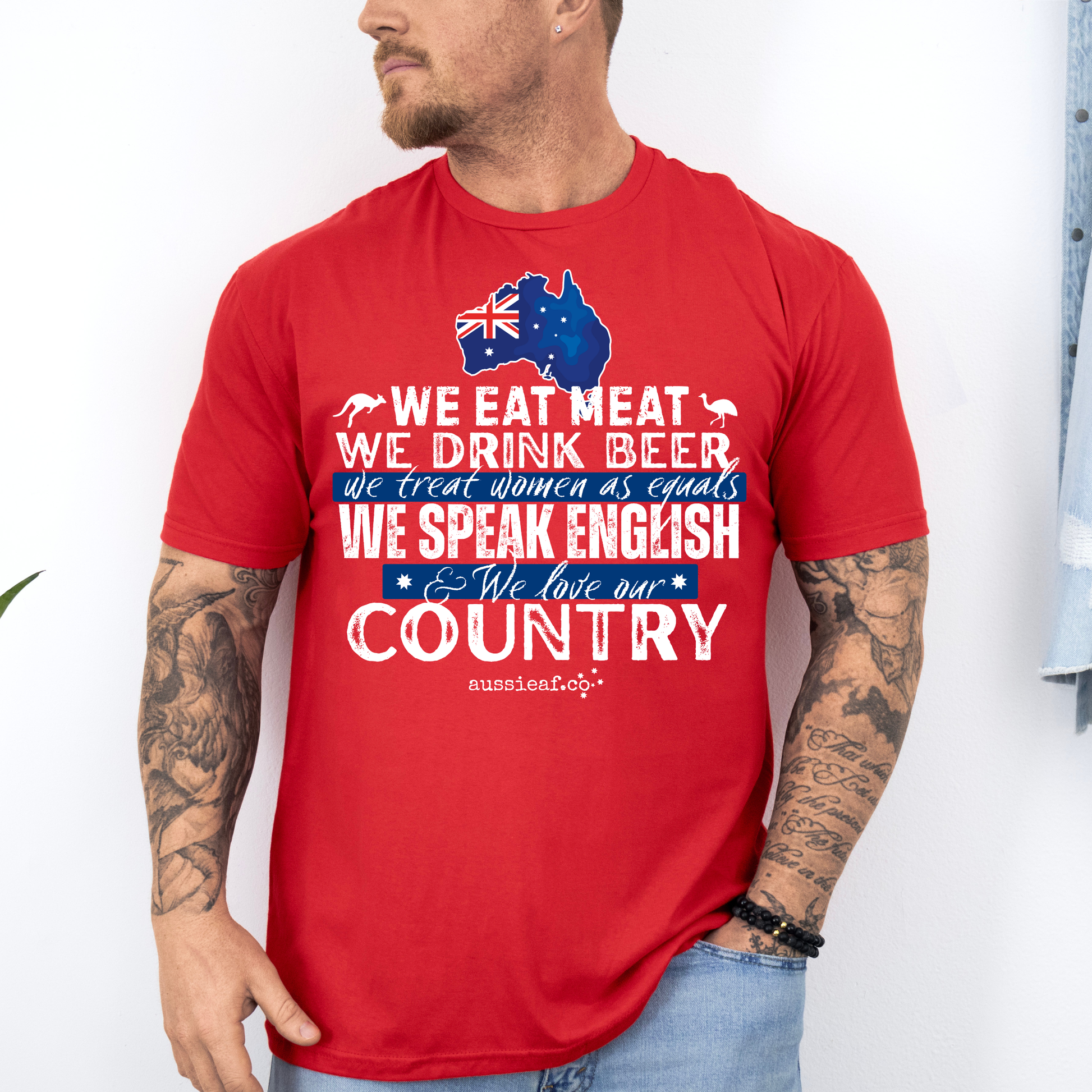 Front Printed Graphic: "We Eat Meat..." with the Australian flag design