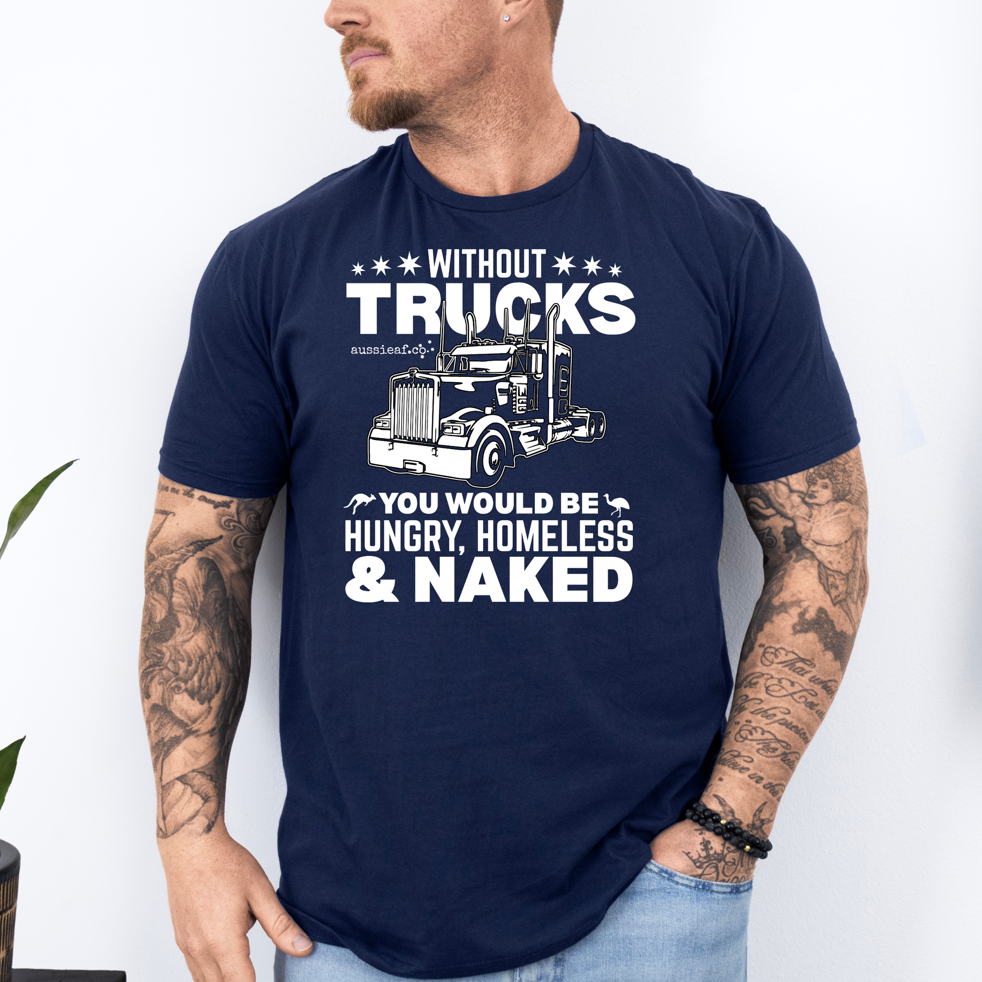 This unisex softstyle tee is a bold tribute to the hardworking truckies who keep the country moving. Featuring the message “Without Trucks You Would Be Hungry, Homeless & Naked”, it’s designed for those who understand the backbone of our economy and the essential role of transport in everyday life.
